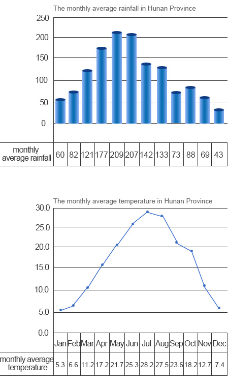 Hunan has a continental, subtropical, seasonally-humid climate with four distinct seasons. It has abundant sun, long frost-free periods, and abundant rainfall. The annual sunshine duration is 1300-1800 hours. The annual average temperature is 16℃-18℃. It is frost-free 260-310 days a year. Annual rainfall is 1200-1700 mm which is favorable for agriculture.