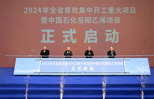 Shen Xiaoming, secretary of the CPC Hunan Provincial Committee; Ma Yongsheng, chairman of the Board and secretary of the CPC Leadership Group of the China Petroleum & Chemical Corporation (Sinopec Group); Mao Weiming, deputy secretary of the CPC Hunan Provincial Committee and governor of the People's Government of Hunan Province; and Zhao Dong, deputy secretary of the CPC Leadership Group and general manager of Sinopec Group, attended the groundbreaking ceremony at the main venue in Yueyang and launched the projects construction together.