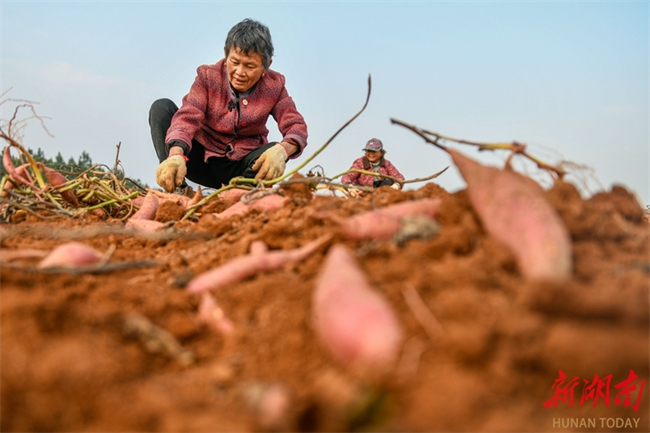 The photo, taken on December 7, shows farmers harvesting sweet potatoes at Dongwei Village, Xianglinpu Town, Daoxian County. Major Snow, or "Da Xue," the 21st solar term on the traditional Chinese calendar, began on that day this year. This solar term marks the beginning of mid-winter. During this solar term, farmers are busy seizing the time to conduct winter farmwork in an orderly manner. (Photo/Jiang Keqing)