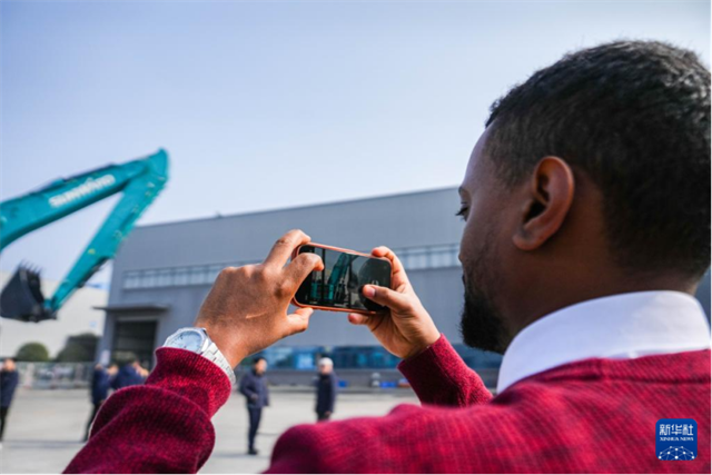 The photo, taken on January 6, shows a customer representative taking photos of the Sunward SWE1650FLR long-reach excavator at the Sunward Industrial Town, Changsha. (Photo/Chen Sihan, Xinhua)