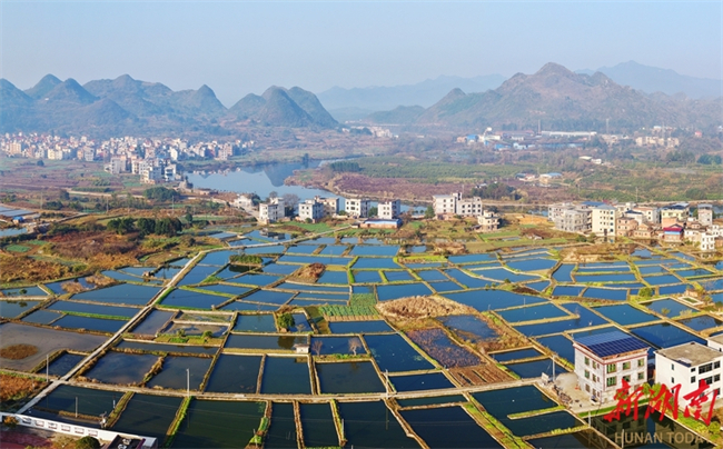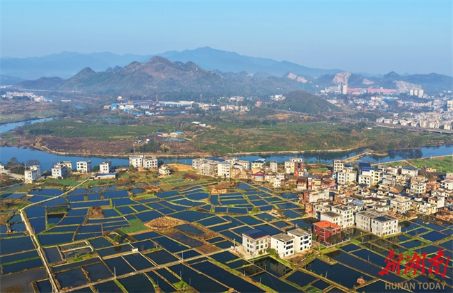 The photo, taken on January 8, shows scattered fishponds, rural dwellings, rivers and roads together forming a rural revitalization scene featuring thriving industry, beautiful ecological environment, and prosperous life in Jinghan Village, Zhuquan Town, Jiahe County. In recent years, the village has leveraged its abundant water resources to develop ecology-friendly fishery and aquaculture, bringing fortune to the villagers. (Photo/Huang Chuntao)