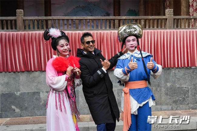 Following a traditional flower-drum opera performance, a foreign talent posed for a group photo with the performers.