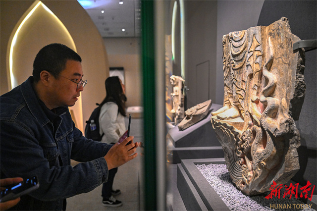 Visitors view Qingzhou-style Buddha statues on display at the Hunan Museum. (Photo/Guo Liliang, Hunan Daily)