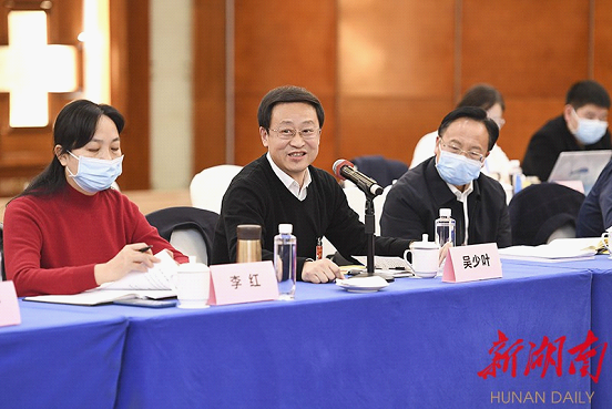 On the morning of January 26, CPPCC Member Ding Jiaming (1st L) proposed to further optimize the talent policy to promote Hunan’s high-quality development during a joint discussion of Hunan Provincial Committee of Jiusan Society, Hunan Association for Science and Technology, and Education Circles. (Photo/Zhao Chi, Hunan Daily)