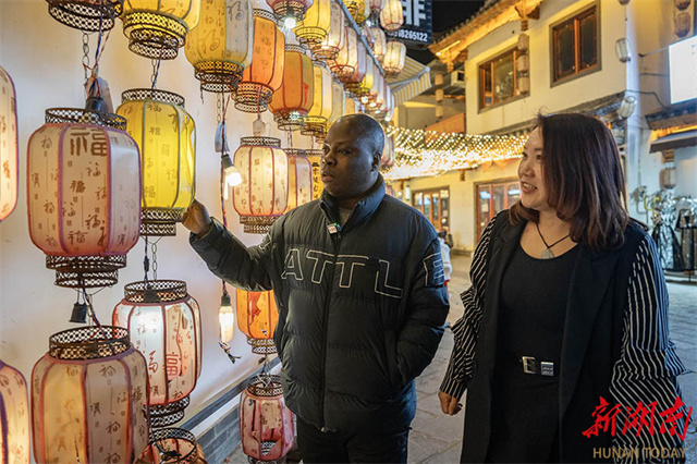 On the evening of February 12, Airui (L) and his wife Li Xiuli enjoyed the night view at Lingling Ancient Town Scenic Area in Yongzhou City, celebrating the Chinese Lantern Festival. After arriving in Hunan in 2014, Airui met and fell in love with Li Xiuli, a native of Yongzhou. They got married in 2017 and have since settled in Yongzhou. Airui expressed his deep affection for China, stating that he and his wife made a special visit to the Lingling Ancient Town during this year's Lantern Festival to experience the strong festive mood. (Photo/Li Jian and Wang Liang, Hunan Daily)