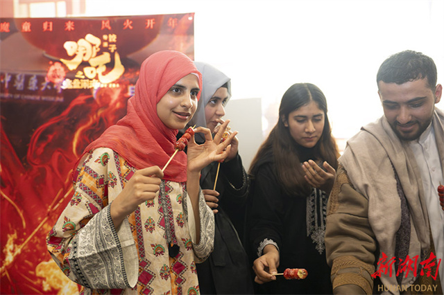The photo, taken on February 25, shows international students showing their handmade "tanghulu", a traditional Chinese snack made of sugarcoated haws and other fruits or vegetables on a stick, at a cinema in Changsha. On the same day, Hunan University of Chinese Medicine launched a study tour themed "Following Ne Zha to Explore Chinese Culture". During the event, international students watched "Ne Zha 2", a Chinese animated blockbuster; delved into the culture of traditional Chinese medicine depicted in the movie; tried their hand at making "tanghulu", a traditional Chinese snack made of sugarcoated haws and other fruits or vegetables on a stick; and, learned paper-cutting skills. The event enabled them to have a close-up experience of traditional Chinese culture. (Photo/Gu Pengbo, Hunan Daily)