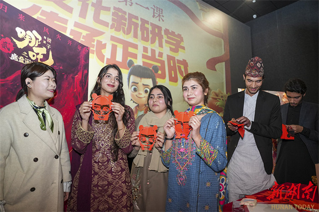 The photo, taken on February 25, shows international students showing their Ne Zha-themed paper-cutting works at a cinema in Changsha. On the same day, Hunan University of Chinese Medicine launched a study