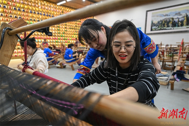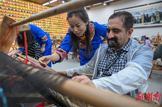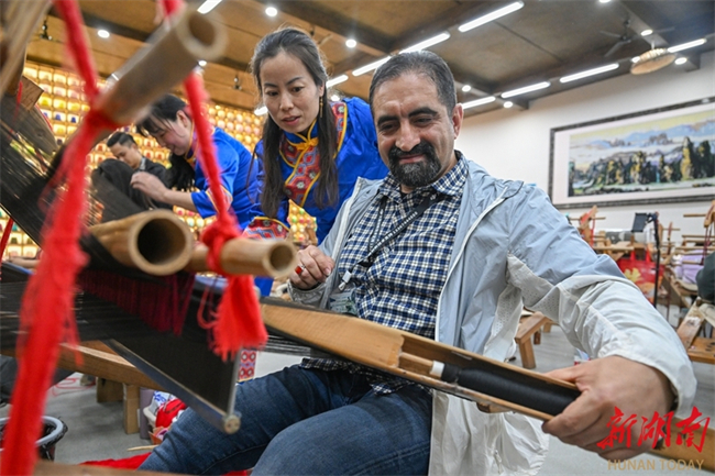 A group of Iranian and Vietnamese travelers visited a Tujia brocade base in Wulingyuan District, Zhangjaijie on April 26. Through observation and hands-on experience, they obtained an up-close understanding of Tujia brocade weaving techniques, a national intangible cultural heritage item in China. (Photo/Guo Liliang, Hunan Daily)