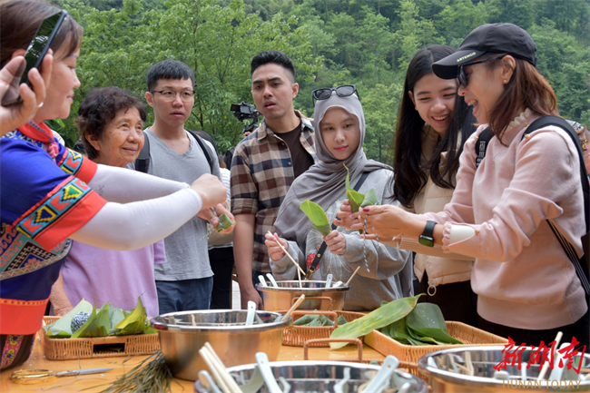 More than 60 travelers from Indonesia participated in a zongzi-making folk custom experience activity after visiting Huanglong Cave Scenic Area in Zhangjiajie, on the occasion of Chinese Duanwu Festival, or Dragon Boat Festival. With the assistance of working staff of the scenic area, they sorted reed leaves, processed different fillings, and tried their hand at making zongzi. Through this immersive experience, they've explored the unique charm of traditional Chinese culture.