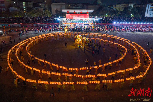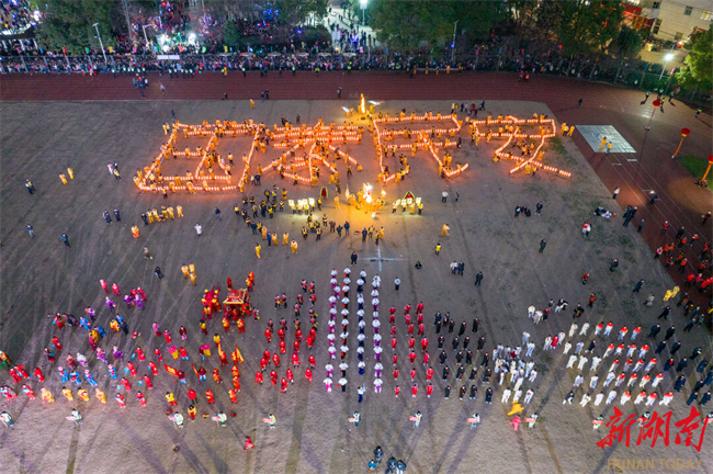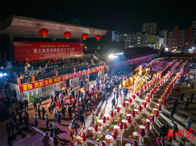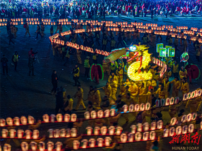 At dusk, the Banban dragon lantern team used 168 light panels and 840 lanterns to light up four Chinese characters that convey the message "May our country enjoy prosperity and our people live in harmony". This is the unique way for the Cili people to extend their best wishes for the motherland and the people.
