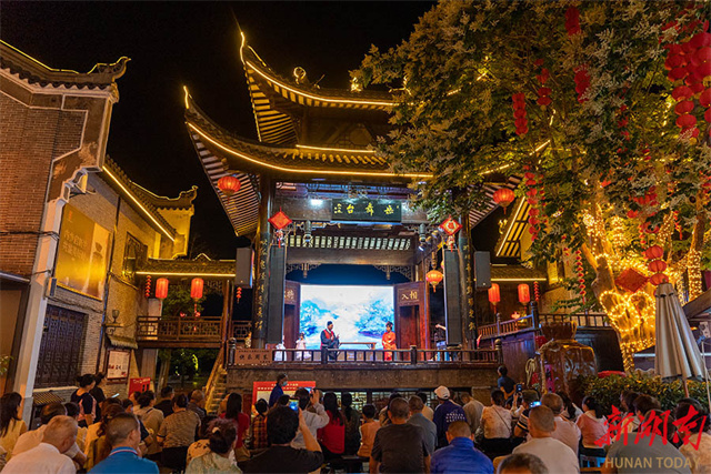 On the evening of May 25, guests and tourists watch an immersive drama titled "Ascending Yueyang Tower" at Yueyang Tower Scenic Area, Yueyang City.
