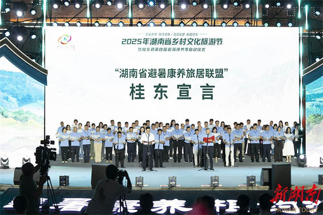 The photo, taken on June 17, shows members of the Hunan Summer Retreat, Wellness and Tourism Alliance reading out the Guidong Declaration. The 2025 Hunan Rural Cultural Tourism Festival and the Fourth Guidong County Summer Retreat & Wellness Season kicked off on that day, with the theme of "Meet in Hunan to Escape Summer Heat and Keep Wellness; Stay in Guidong to Breathe the Cool, Pure Air." With Guidong County as the main venue, the festival is scheduled to be simultaneously held in Chaling County, Taojiang County, Jindong Administrative Area, and Huayuan County. The move aims to promote a synergy across the province to blueprint a new vision of summer retreat and wellness tourism on a broader scale. (Photo/Guo Liliang and Gu Pengbo, Hunan Daily)