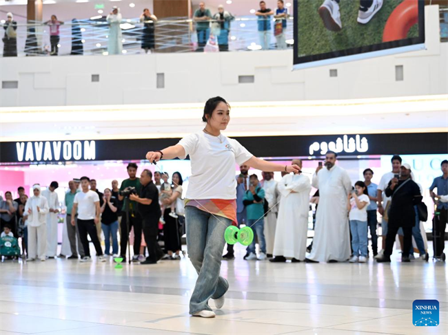 An artist from China's Hunan Province performs during a flash mob show at the Avenues Mall in Farwaniya Governorate, Kuwait, on Sept. 4, 2024. (Photo by Asad/Xinhua)