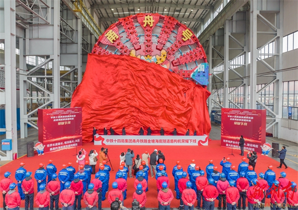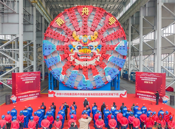 A super-large-diameter shield tunneling machine "Yongzhou" rolled off the assembly line in Changsha on February 26, 2024. It was jointly developed by the China Railway 14th Bureau Group Corporation Limited and the China Railway Construction Heavy Industry Corporation Limited. With a Chinese dragon pattern on its cutterhead, the machine is 135 meters in length and its excavation diameter reaches 14.57 meters. It will be utilized in the construction of Jintang Undersea Tunnel-the world's longest undersea high-speed railway tunnel linking Ningbo and Zhoushan. (Photo/Li Jian)