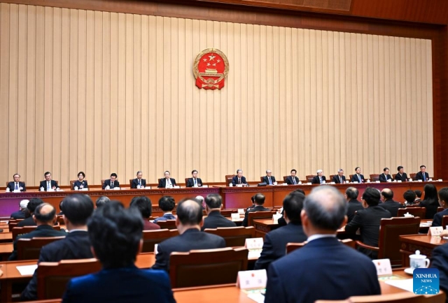 Zhao Leji, chairman of the National People's Congress (NPC) Standing Committee, presides over the first meeting of the presidium of the third session of the 14th NPC at the Great Hall of the People in Beijing, capital of China, March 4, 2025. (Xinhua/Yan Yan)