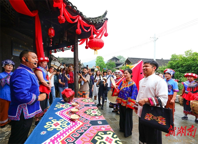 The photo, taken on May 17, shows performers staging a Tujia wedding custom performance at the Rebala Scenic Area in Miao'ertan Town, Longshan County. (Photo/Zeng Xianghui)