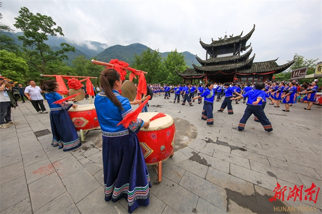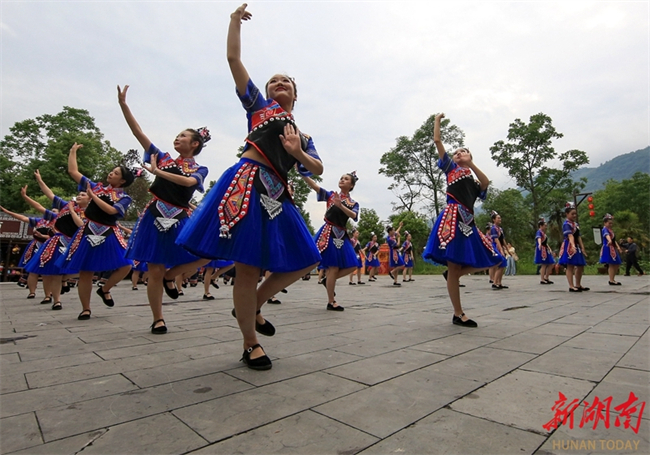 The photo, taken on May 17, shows performers staging Tujia hand-waving dance at the Rebala Scenic Area in Miao'ertan Town, Longshan County. (Photo/Zeng Xianghui)
