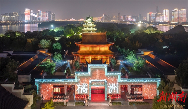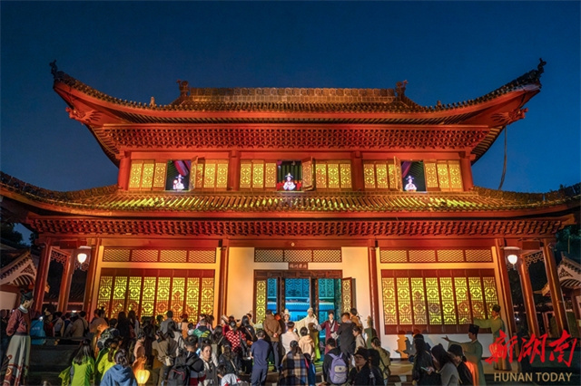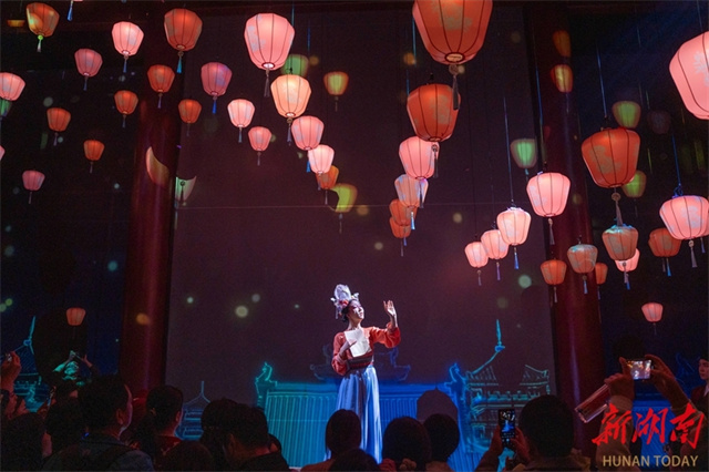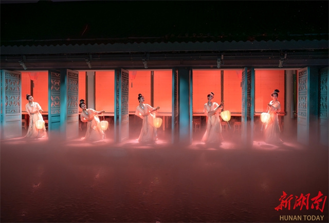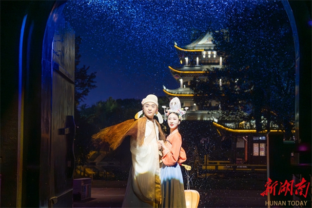 The Jiangtian Muxue Cultural Park opened to the public at the Orange Isle Scenic Area on the evening of November 6. An art performance featuring the park was staged that night, highlighting characters and stories in the Song Dynasty (960-1279). The show is enhanced by technologies that create stunning effects, including sound, light, water, fog, and electricity, making it a new experiential space on Orange Isle. The photo shows artists staging a performance. (Photo/Gu Pengbo)