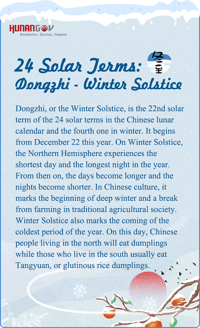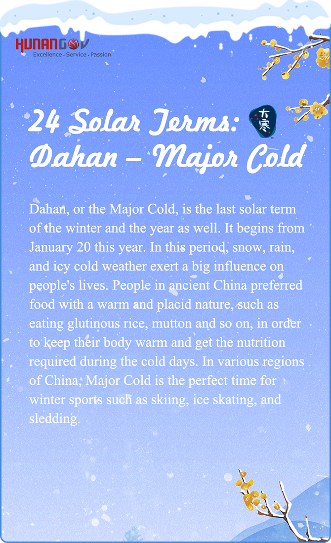 In the ancient days, the solar terms were important instructions for agricultural production as well as people's daily lives. For example, the "Start of Spring", "Start of Summer", "Start of Autumn" and "Start of Winter" divided a year into four seasons, and each season was divided into six solar terms. Some solar terms may mark things like temperature, growth of the crops, and weather conditions, such as “Minor Snow”, “Winter Solstice”, and “Major Cold”.