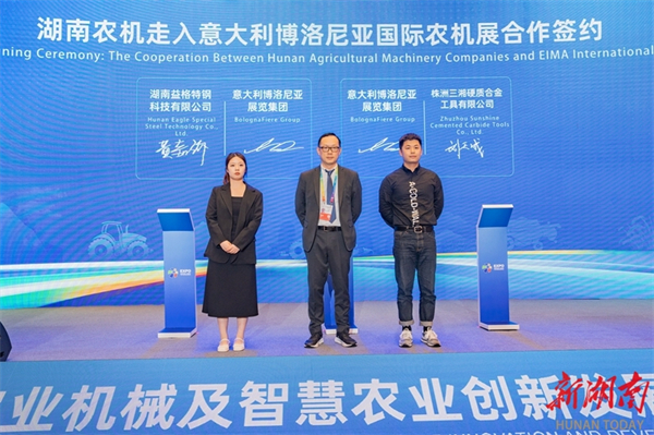 The International Agricultural Machinery, Smart Agriculture Innovation and Development Conference, a special event of the Expo Central China 2024, took place in Changsha on June 1. The theme of the conference was "International Vision, Smart Agriculture, and Achievements Exhibition". At the conference, representatives from relevant enterprises in Hunan Province and Italian enterprises, and university experts made special reports on international topics such as the digital and intelligent transformation of global agricultural machinery manufacturing. The photo shows a signing ceremony for the cooperation between Hunan agricultural machinery companies and EIMA International. (Photo/Li Jian and Hu Panpan, Hunan Daily)