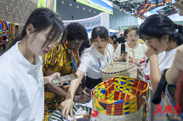 On June 15, people pruchased characteristic African commodities at the Changsha International Convention and Exhibition Center. A briefing on the outcomes of the Fourth China-Africa Economic and Trade Expo was held on the same day. As of 12:00 on June 15, the number of visits to this year's expo exceeded 200,000, doubling that of the previous session. (Photo/Gu Pengbo, Hunan Daily)