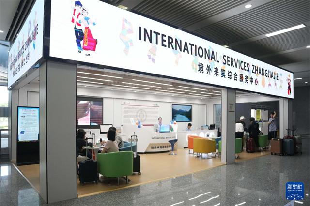 The photo, taken on May 20, shows a view of the International Service Center for Foreigners at Zhangjiajie Hehua International Airport. Foreign tourists can exchange currency, inquire about transportation information, and purchase a local SIM card here. (Photo/Xue Yuge, Xinhua)
