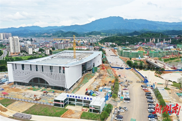 The photo, taken on June 29, shows workers carrying out exterior decoration work at the Huaihua Grand Theater. Currently, Huaihua City is taking all-out efforts to advance the construction of cultural and tourism projects, with all construction units implementing detailed plans and working out timetables to ensure the on-time delivery of key projects for the fifth Hunan Tourism Development Conference. (Photo/Chai Junlin)
