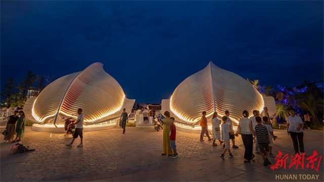 The photo, taken on the evening of September 13, shows tourists having fun at the Tianwen Island Scenic Area in Huaihua. Recently several cultural tourism projects in Huaihua City have been successively put into operation, including the ASEAN Complex-Southeast Asian Cultural Park; Tianwen Island; Yushuwan Cultural, Tourism and Commercial Complex; and, Huaihua Grand Theater. These additions not only enrich the city's cultural and tourism offerings but also inject momentum into the Fifth Hunan Tourism Development Conference, presenting a fresh new look for the grand event. (Photo/Tong Zhenxi, Hunan Daily)
