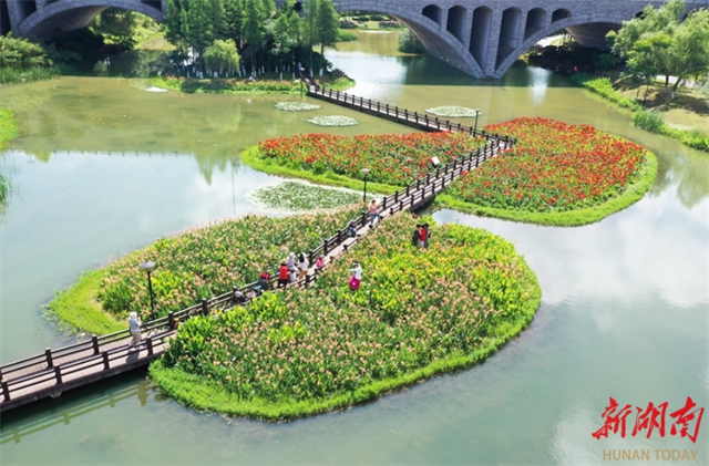 The photo shows tourists enjoying blooming canna flowers at a wetland garden in the southeast corner of the Songya Lake National Wetland Park, Changsha County. (Photo/Tian Chao, Hunan Daily)