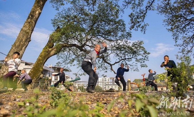 Photo taken on November 24 shows Wen Shaodi, the six-generation inheritor of Wenjiaquan (Wen’s family boxing), practices Wenjiaquan with villagers at Shiling Township, Dong’an County.